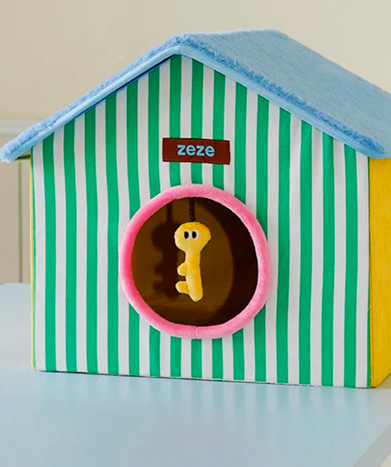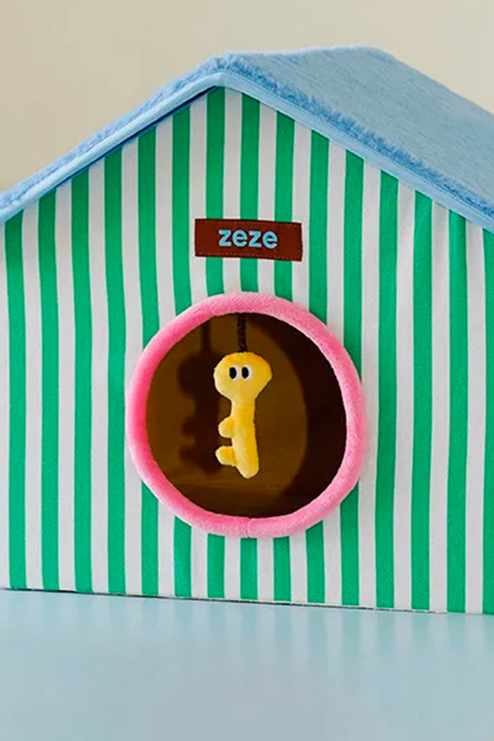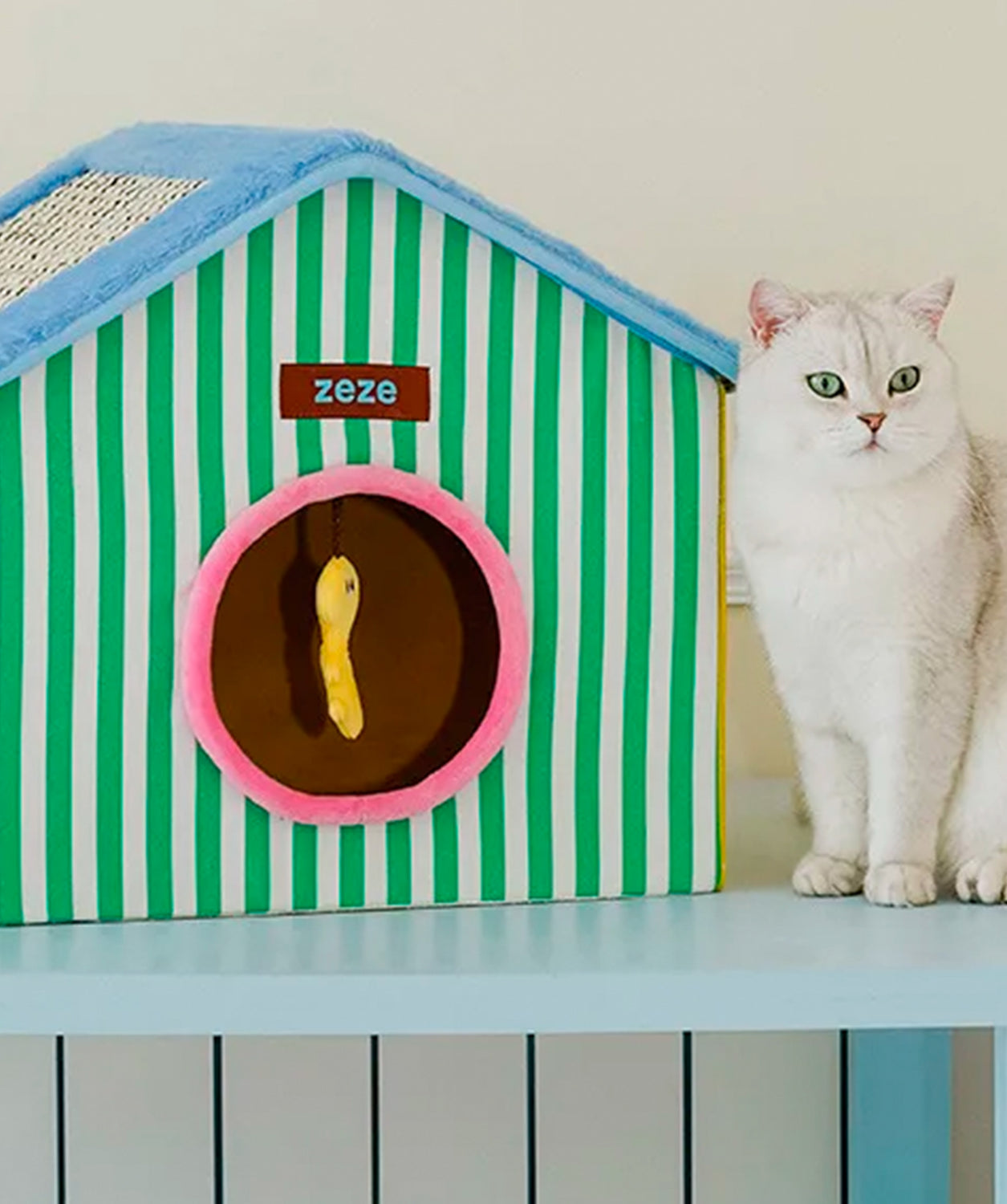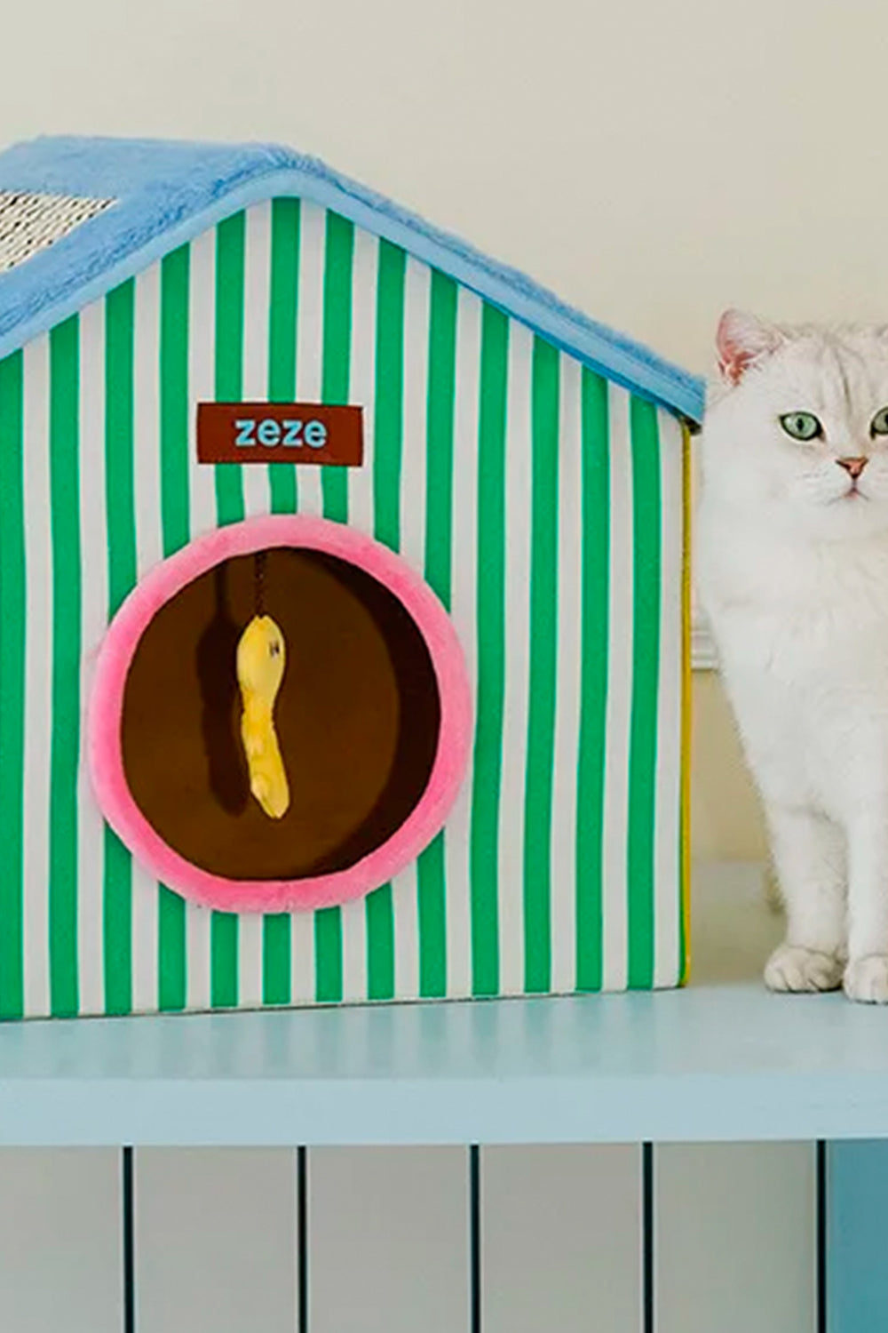 La Casita Rayas de Zeze es mucho más que una simple cama: es un pequeño hogar lleno de comodidad, juego y estilo. Con su divertido diseño de rayas verdes, detalles de colores vibrantes y un techo azul acolchado, esta casita se convertirá en el refugio favorito de tu minino y en un accesorio encantador para tu hogar.