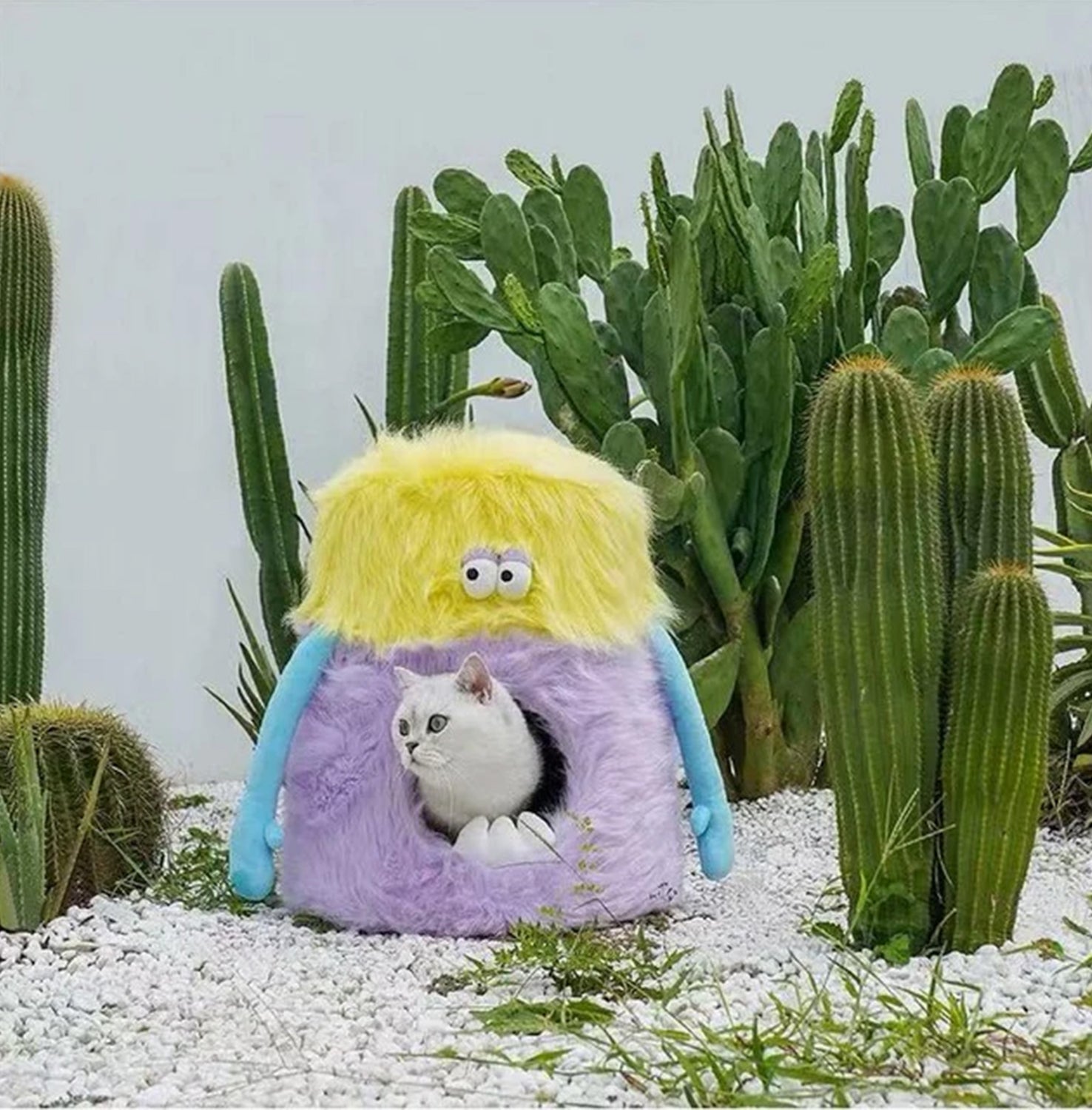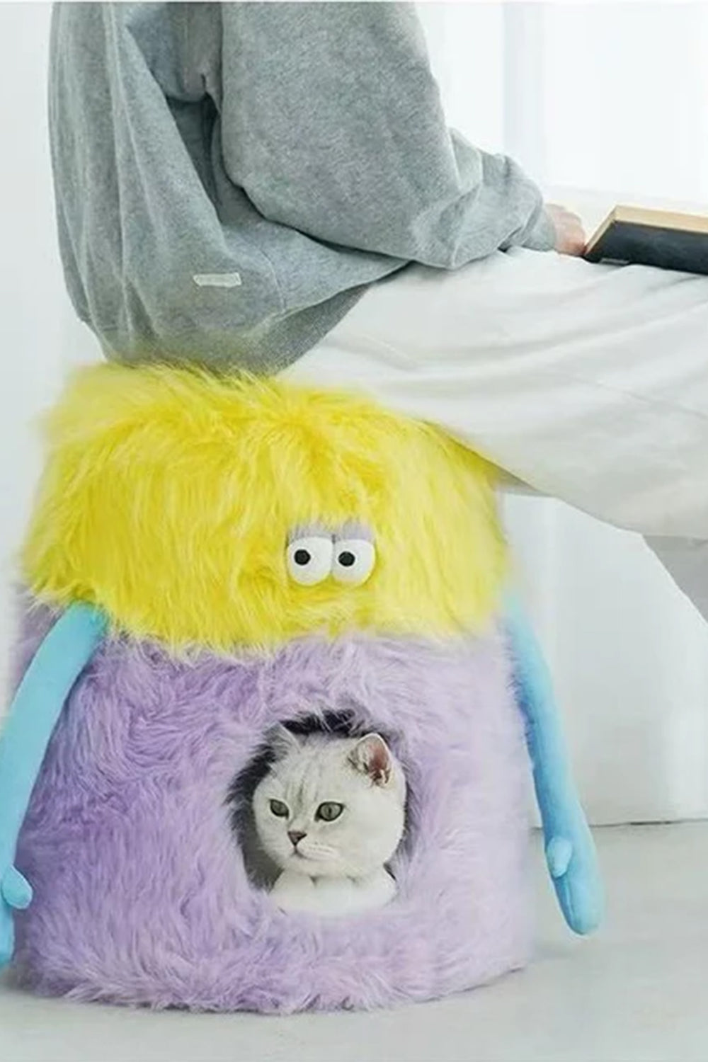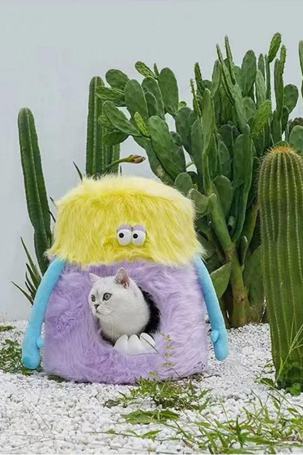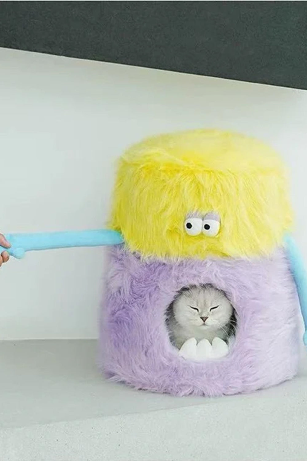 La Monster Pet House tiene un diseño único en forma de monstruo con suaves tonos amarillo y morado, brazos acolchados y simpáticos ojos que la convierten en un accesorio lleno de estilo y alegría para tu hogar.