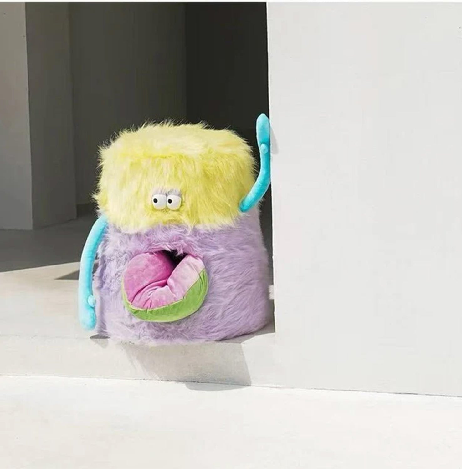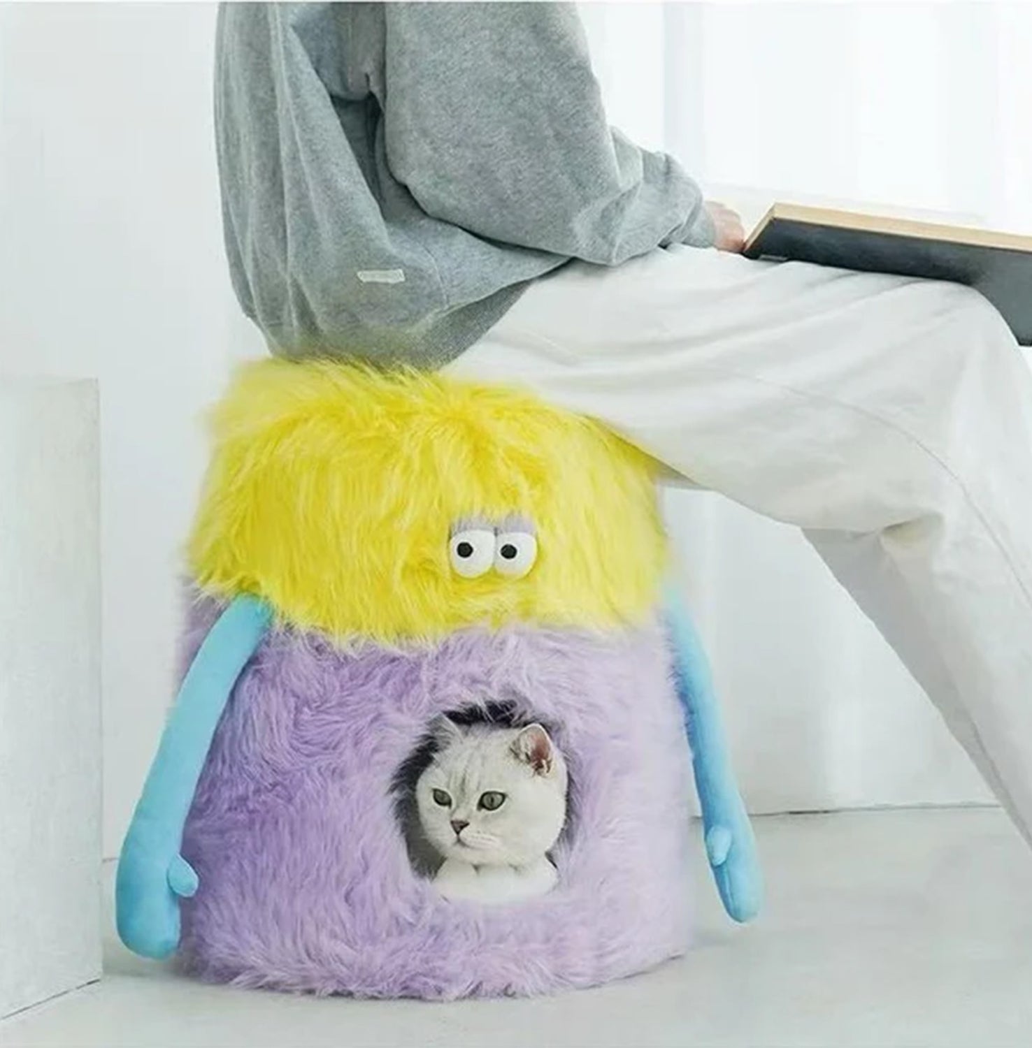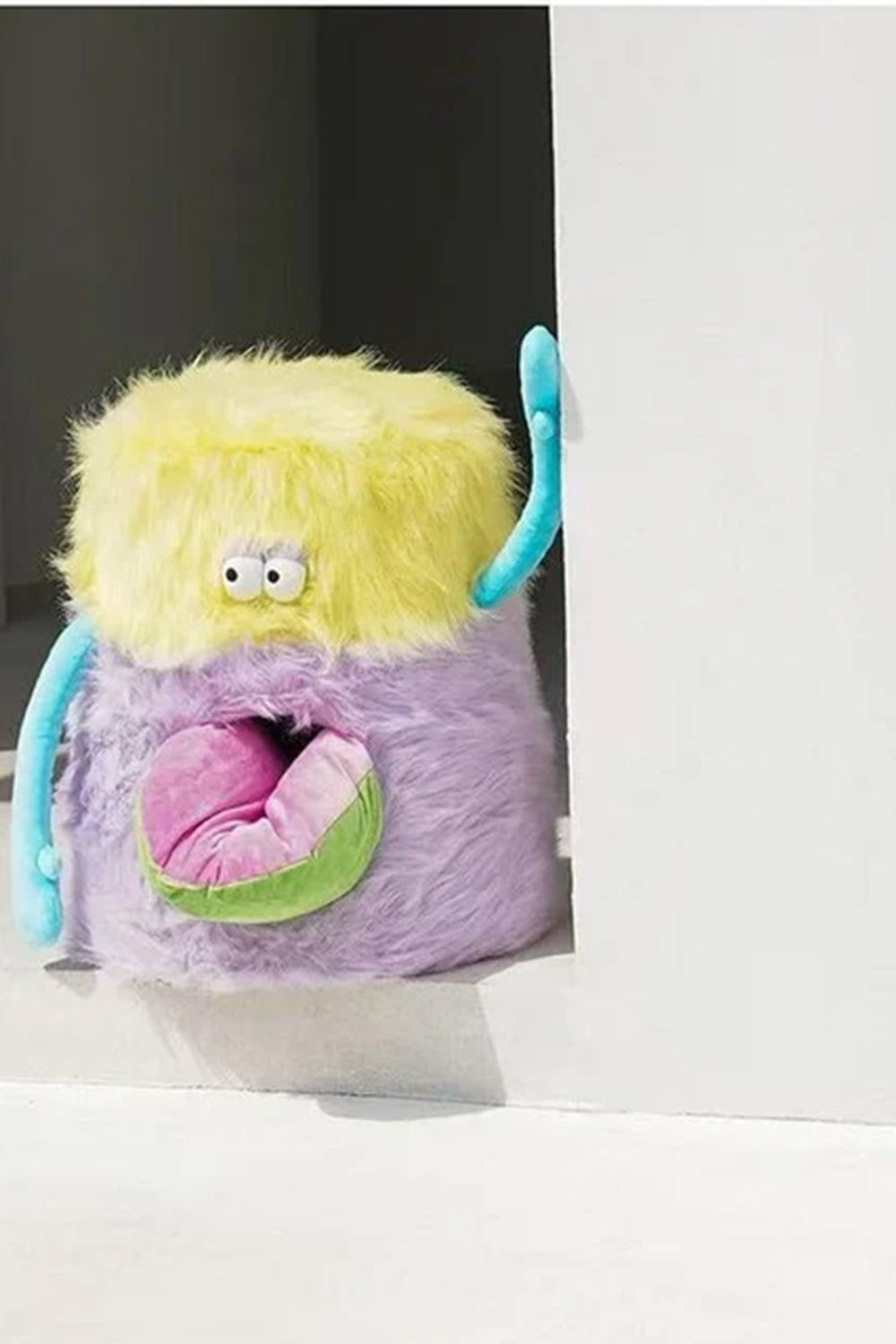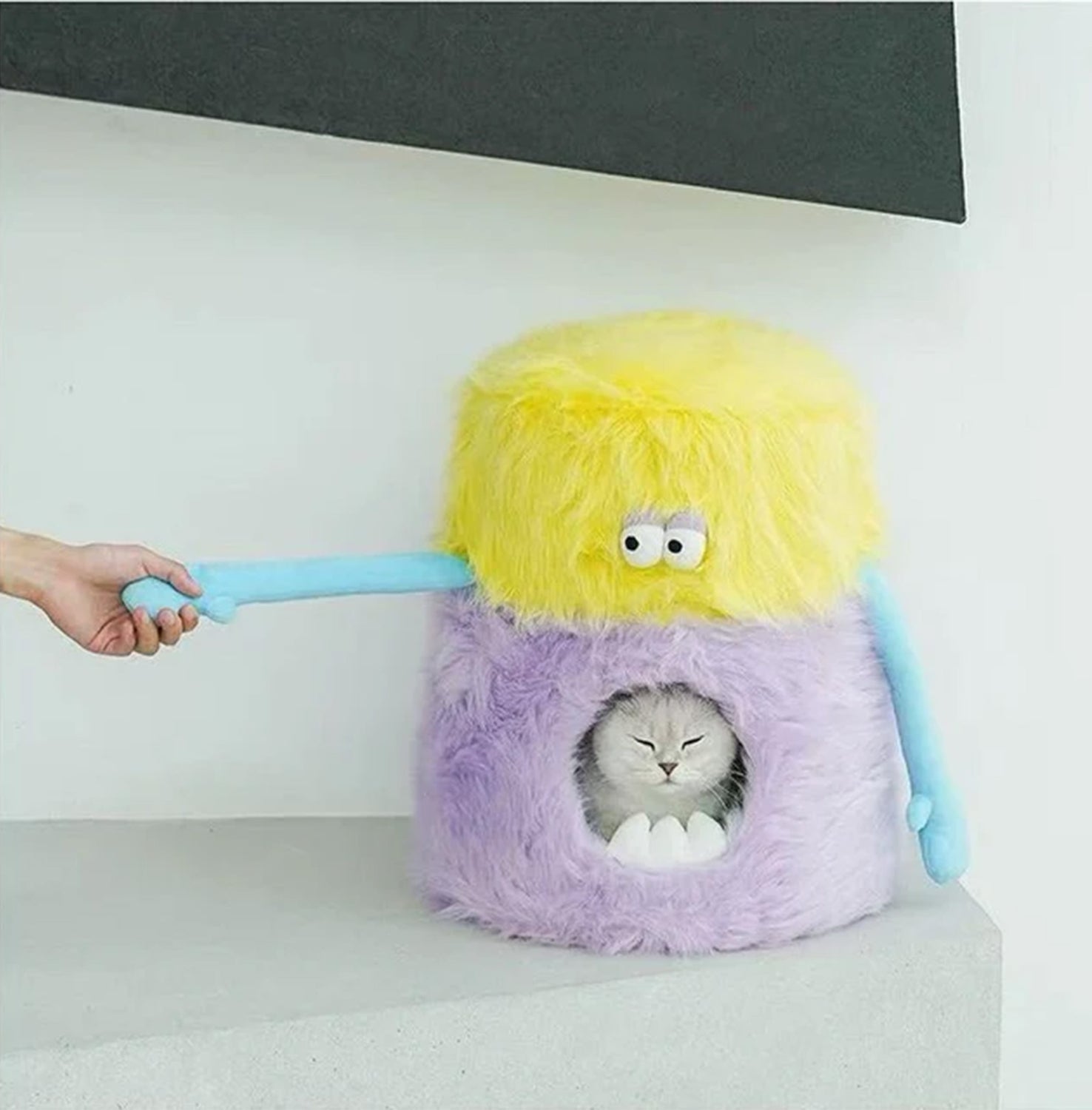 La Monster Pet House tiene un diseño único en forma de monstruo con suaves tonos amarillo y morado, brazos acolchados y simpáticos ojos que la convierten en un accesorio lleno de estilo y alegría para tu hogar.