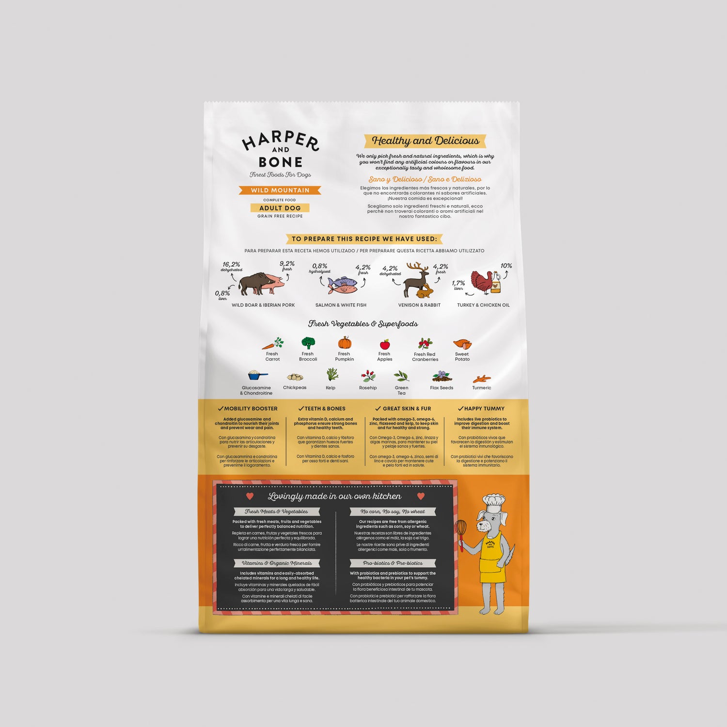 Maiale iberico disidratato 14,9%, patata disidratata, olio di pollo (protetto con tocoferoli naturali) 8,9%, piselli verdi interi, maiale iberico disossato preparato in fresco 7,2%, amido di patata, cervo disidratato 4,2%, salmone preparato in fresco 4,2%, coniglio disossato preparato in fresco 4,2%, cinghiale disossato preparato in fresco 4,2%, ceci interi 4,2%, piselli gialli interi 4%, fibra di mela, patata dolce disidratata 2,1%, minerali, tacchino idrolizzato 1,7%, fegato di maiale idrolizzato 0,8%, pesce idrolizzato 0,8%, semi di lino (fonte naturale di acidi grassi ω3) 0,6%, polpa di barbabietola, lieviti (Saccharomyces cerevisiae), broccoli freschi 1000 mg/kg, zucca fresca 1000 mg/kg, mele fresche 1000 mg/kg, carote fresche 1000 mg/kg, glucosamina 1000 mg/kg, condroitina 600 mg/kg, parete cellulare idrolizzata di lieviti (fonte di MOS) 500 mg/kg, cicoria (fonte di FOS) 500 mg/kg, estratto di mandarino 400 mg/kg, Yucca schidigera 200 mg/kg, alga kelp 30 mg/kg, mirtilli rossi interi 30 mg/kg, rosa canina (ricca di vitamina C) 30 mg/kg, tè verde 30 mg/kg, curcuma 30 mg/kg.
