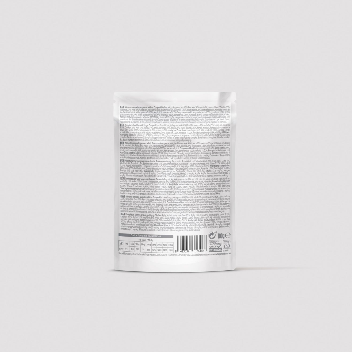 Pesce, pollo, tacchino e maiale 60% (Pesci 16%: salmone 6%, pesce bianco 5%, tonno 2,5% e sardine 2,5%. Pollo 15%. Maiale 15%. Tacchino 14%), brodo, carote 3,40%, piselli 3,25%, patata dolce 3,25%, olio di pesce, minerali, semi di lino (fonte naturale di acidi grassi ω3) 0,01%, kelp 0,01%, rosa canina 0,01%.