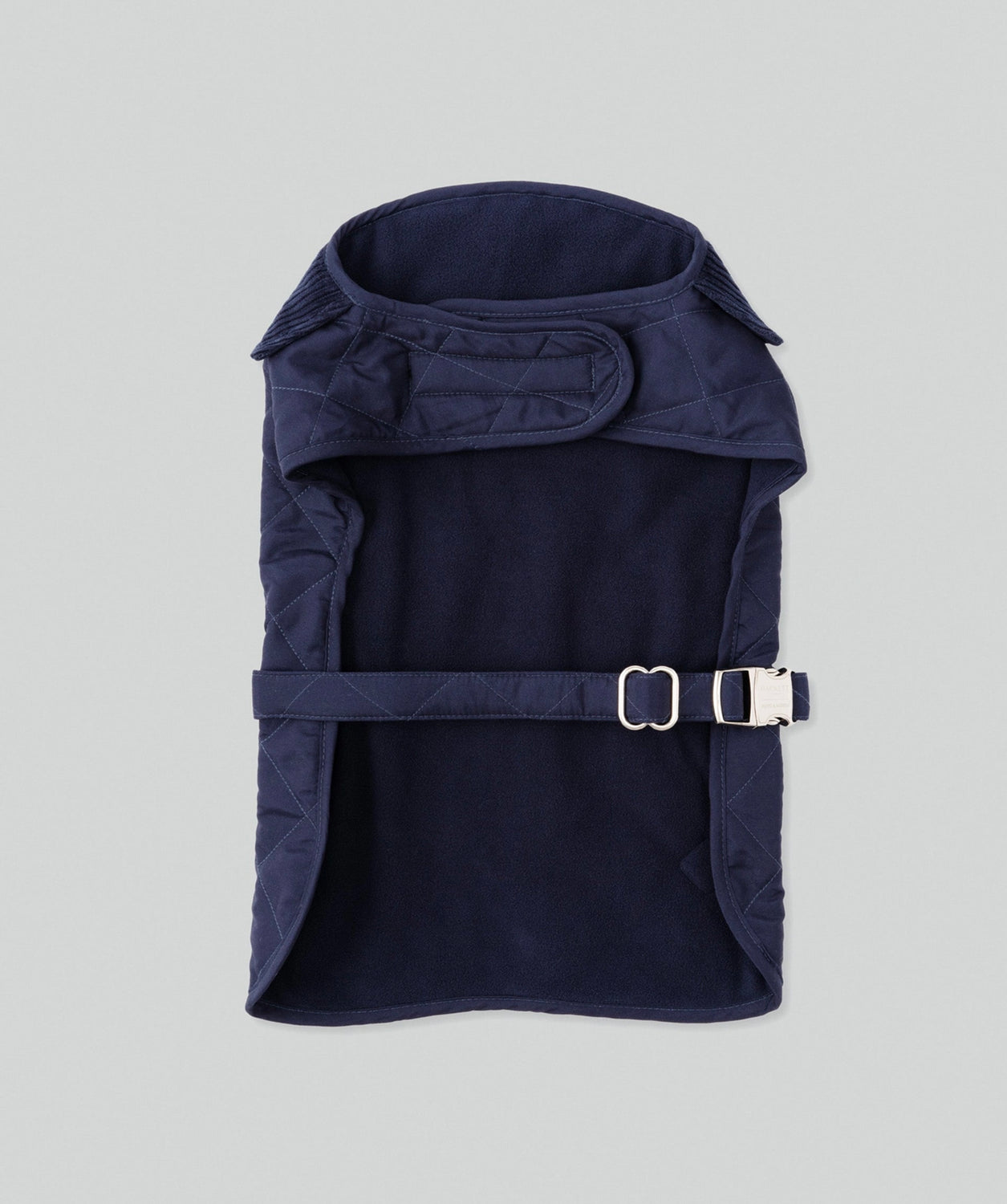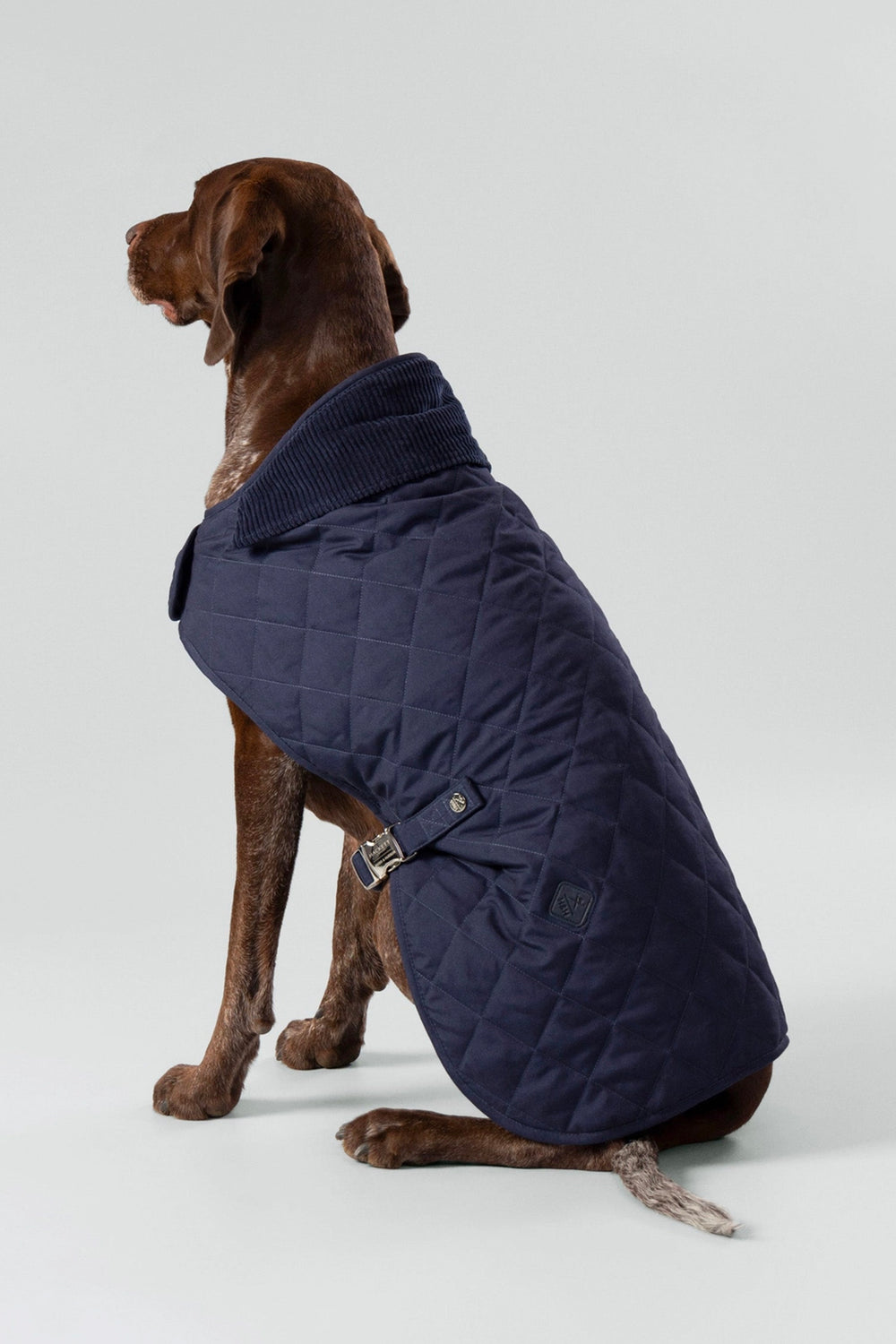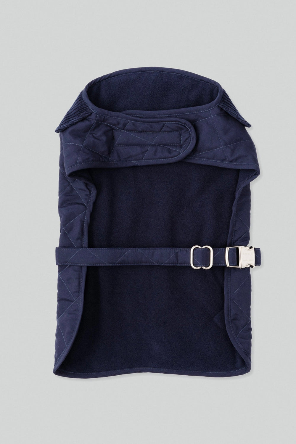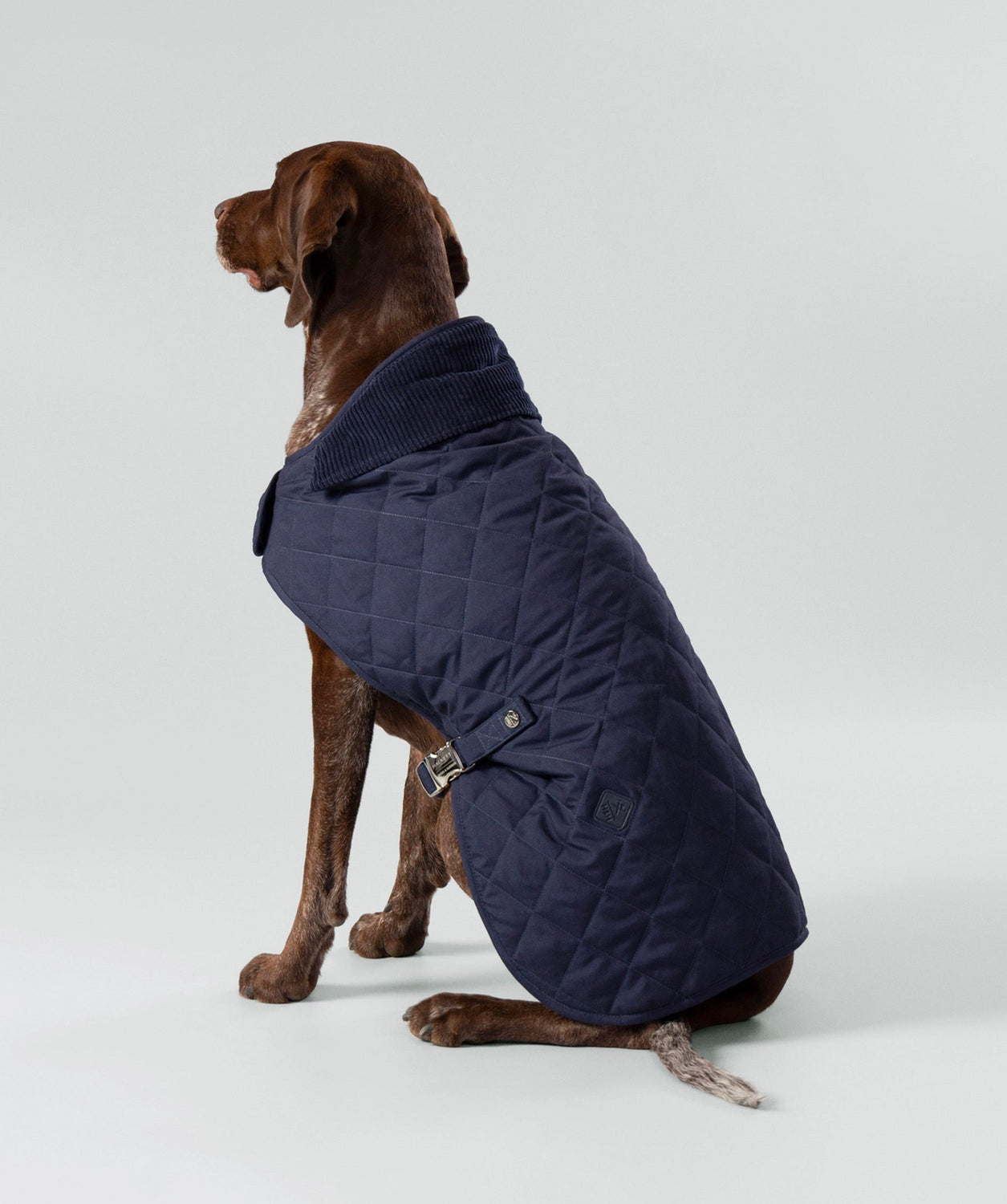 Hackett x Hugo & Hudson. We presenteren dit gewatteerde marineblauwe hondenjasje, gemaakt van een zachte polyesterblend. Het valt op door de opvallende corduroykraag, metalen studs, een met laser gegraveerde metalen gesp en een zachte fleecevoering om je huisdier warm te houden.