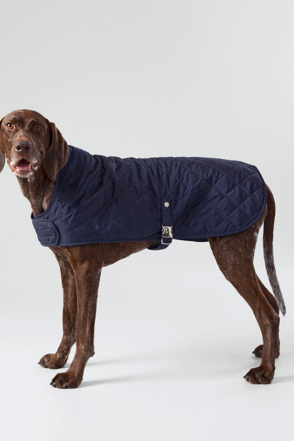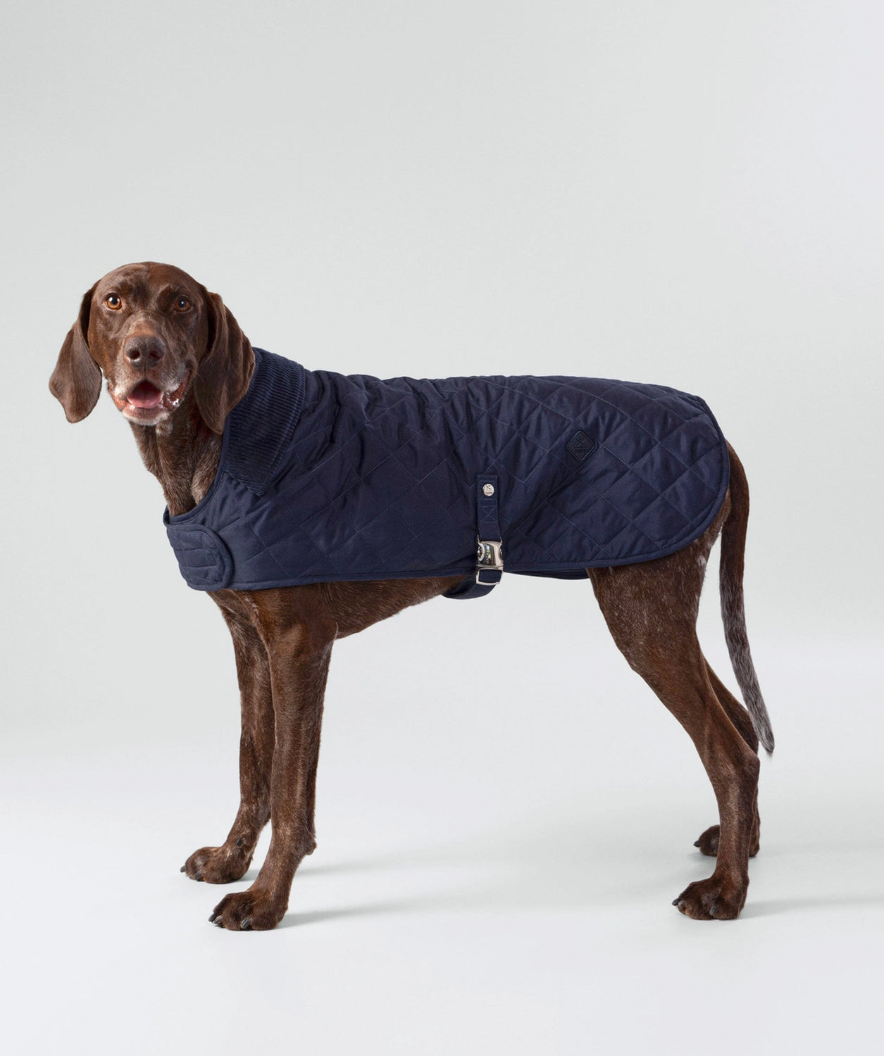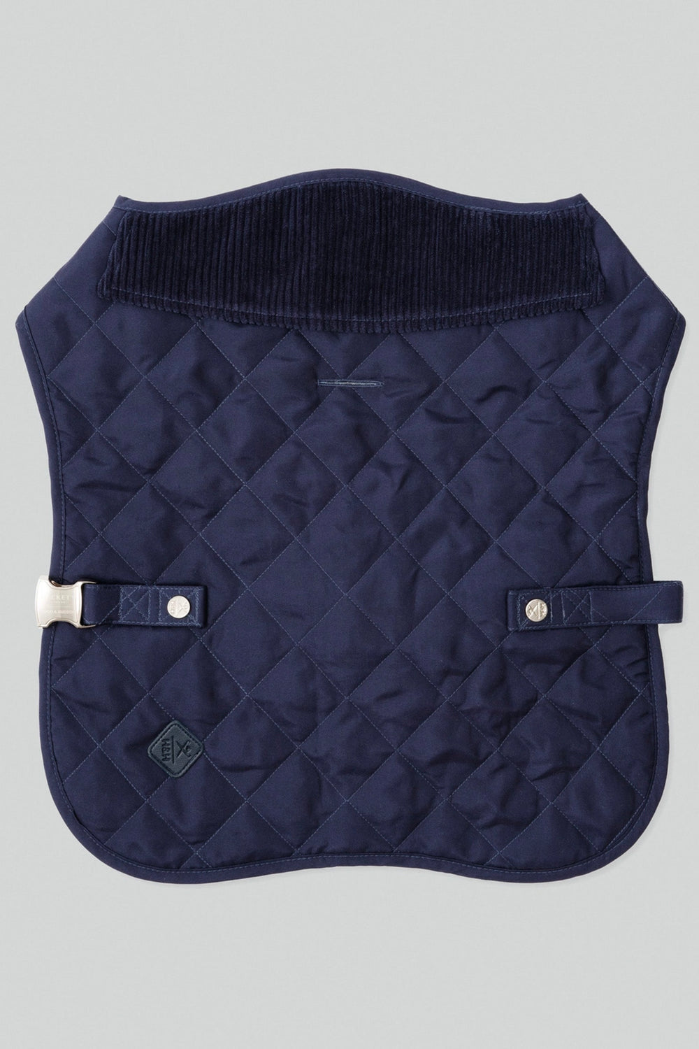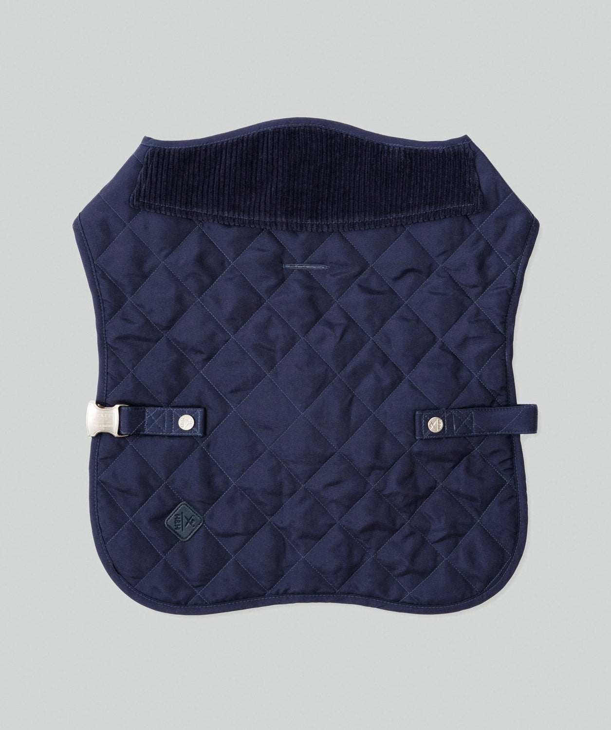 Hackett x Hugo & Hudson. We presenteren dit gewatteerde marineblauwe hondenjasje, gemaakt van een zachte polyesterblend. Het valt op door de opvallende corduroykraag, metalen studs, een met laser gegraveerde metalen gesp en een zachte fleecevoering om je huisdier warm te houden.