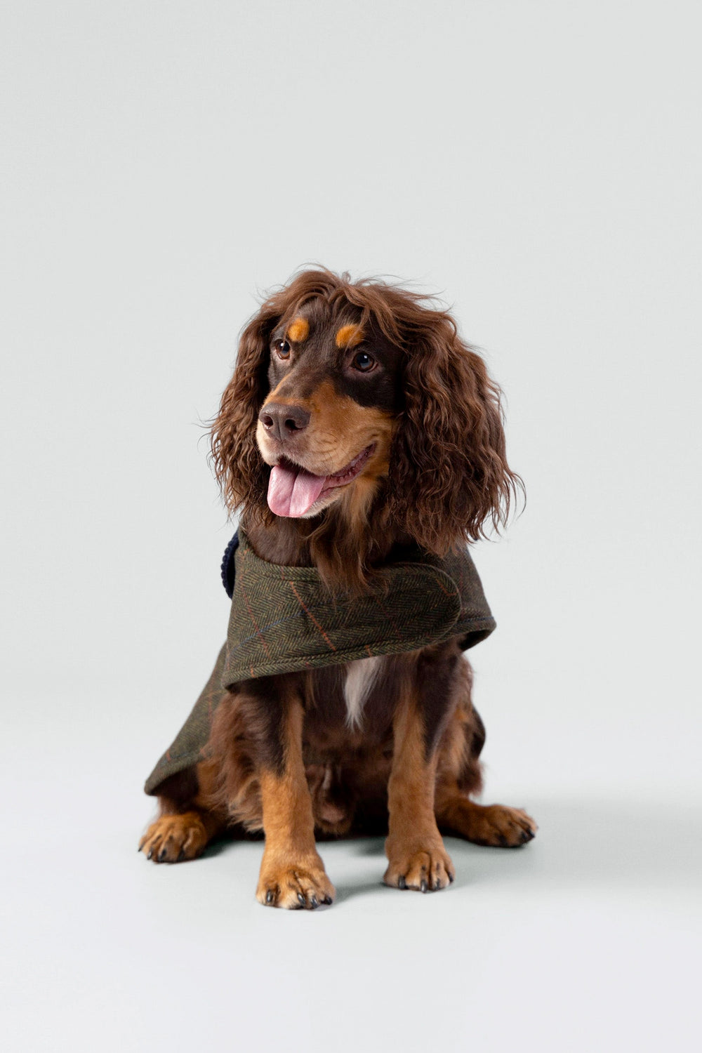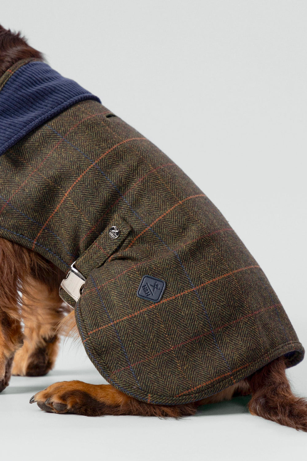 Gemaakt van een traditioneel tweedweefsel combineert deze jas de zachtheid van wol met het comfort van polyester. Het kledingstuk heeft een speciaal donkergroen tweedpatroon over een elegant geruit visgraatmotief, een corduroy overhemdkraag en een fleecevoering om je huisdier warm te houden.