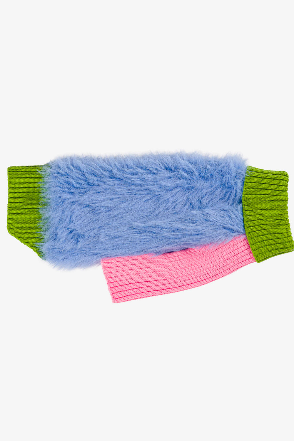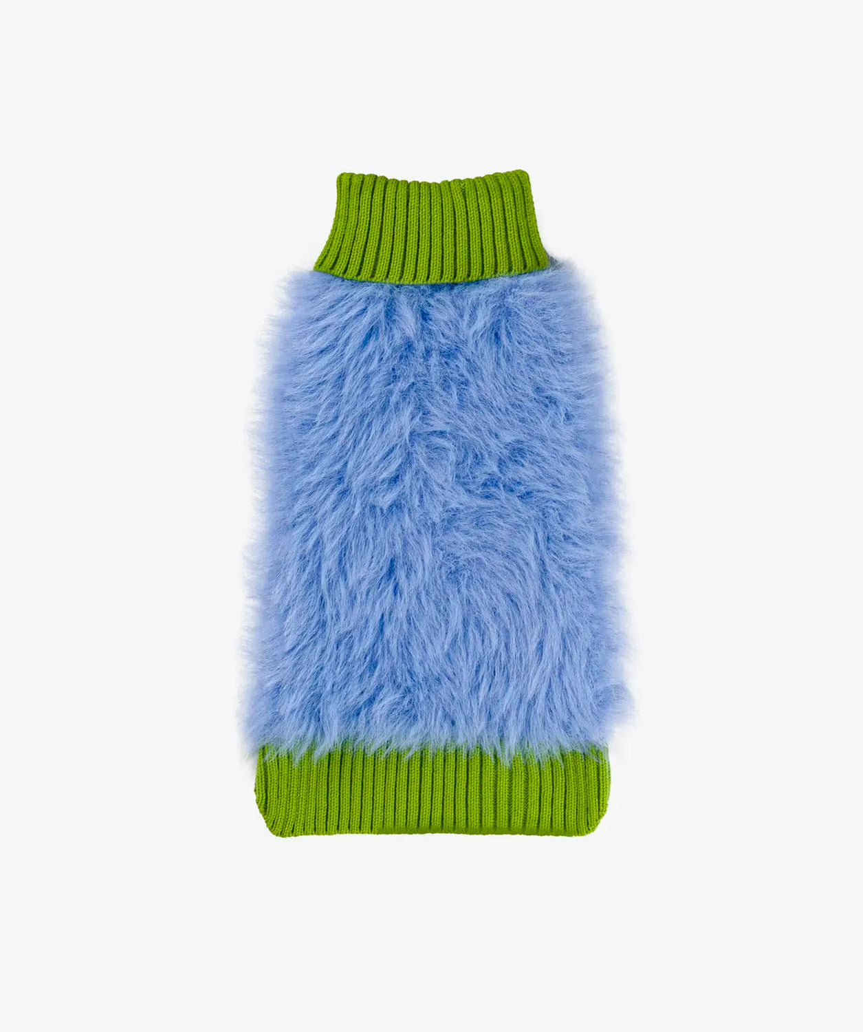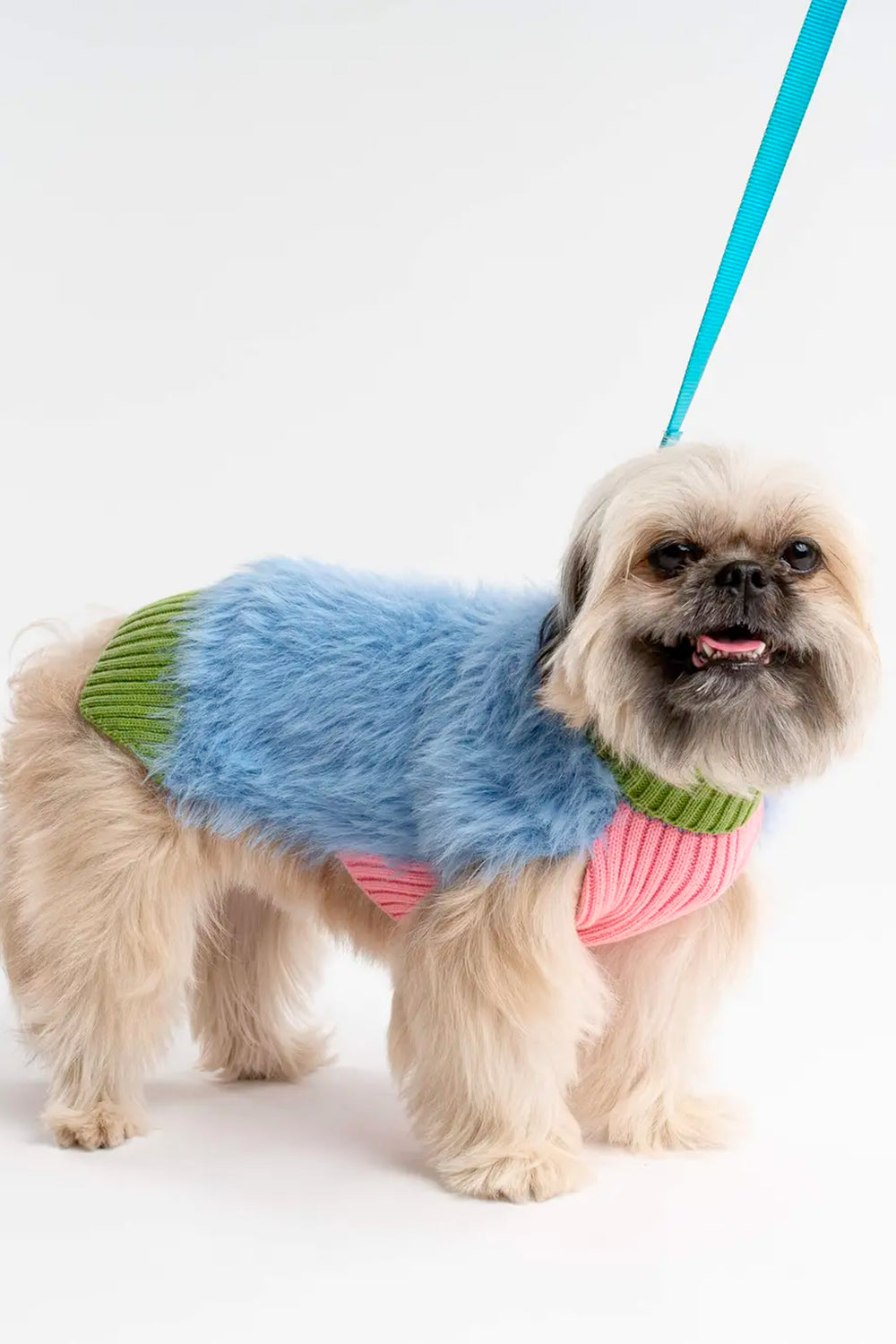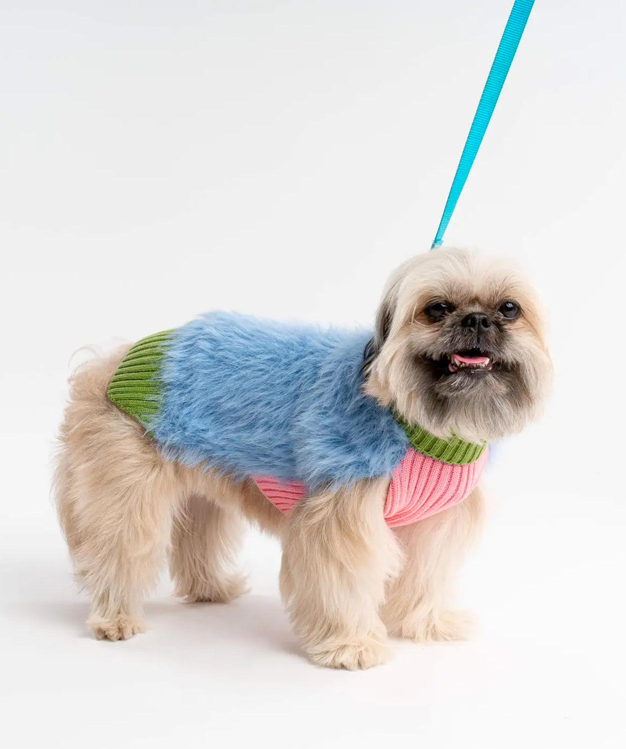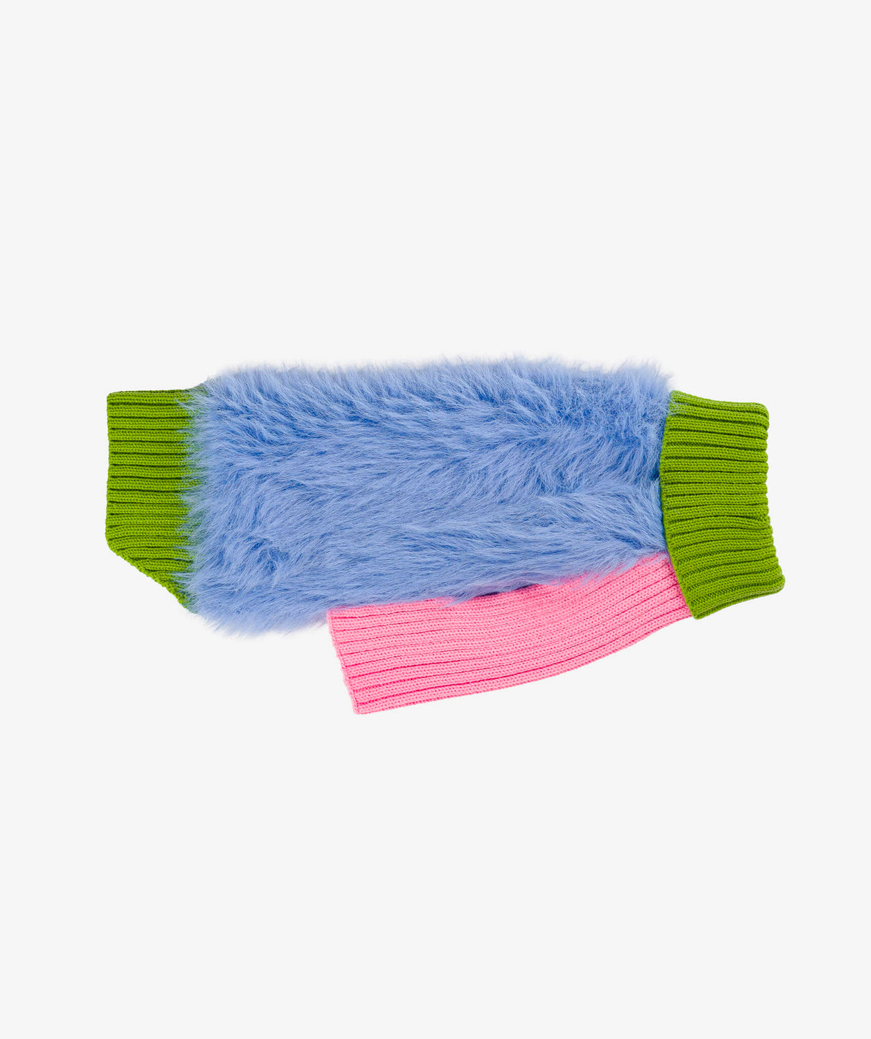 Gebreide hondentrui van zachte imitatievacht met contrasterende geribde onderzijde en col. Voorzien van een opening aan de achterkant voor een harnas. Hypoallergeen en wasbaar materiaal.