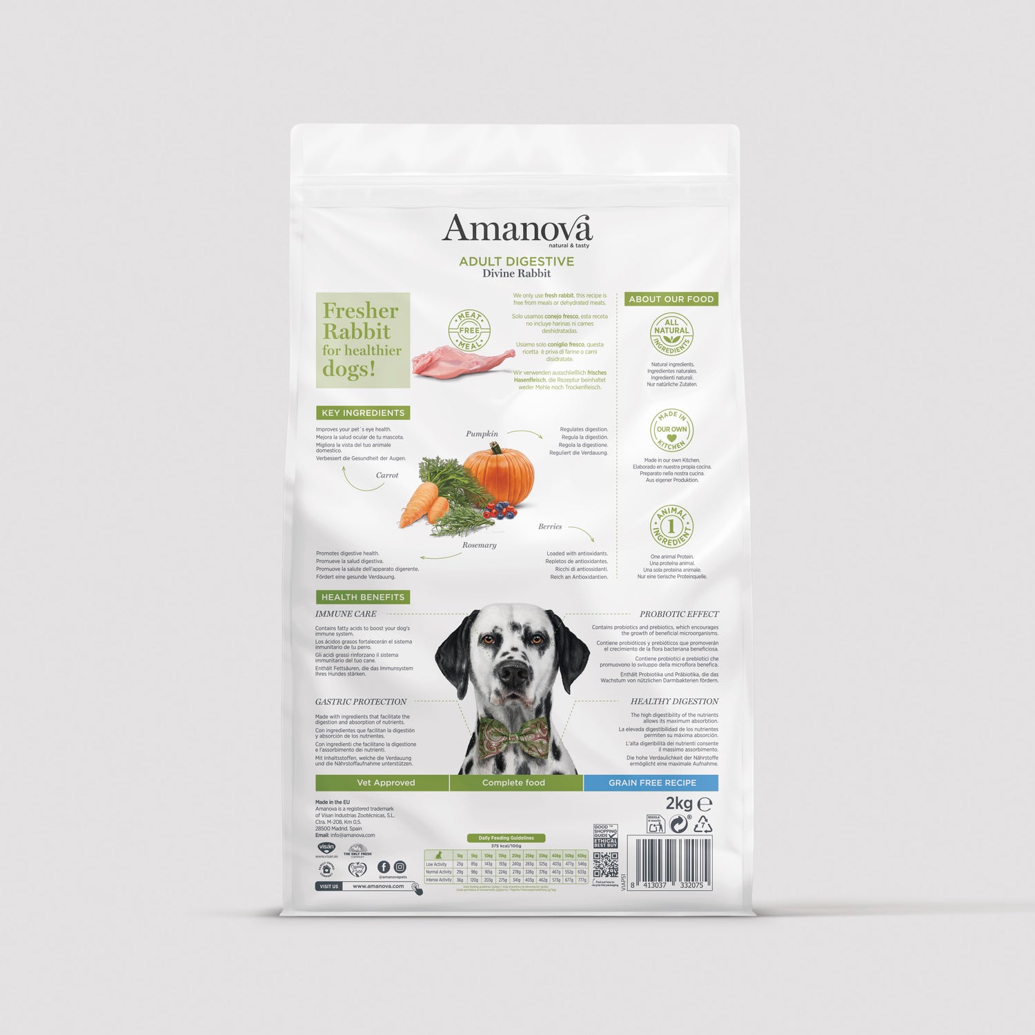 Elaborado únicamente con carne frescaContenido de Carne FrescaContenido de Harinas cárnicas o proteína deshidratadaContiene una sola fuente de proteína animalLibre de soja, maíz o trigo