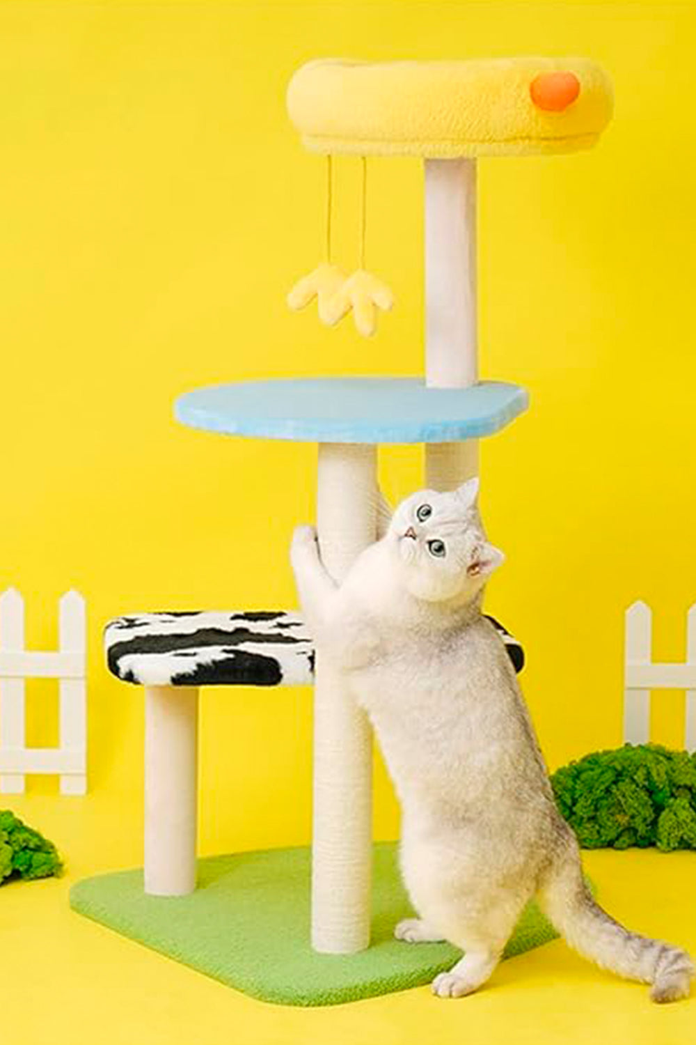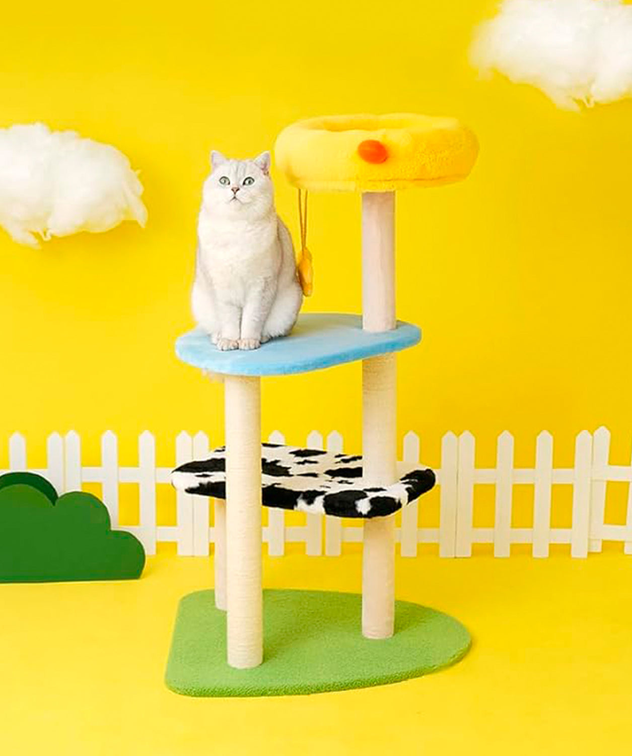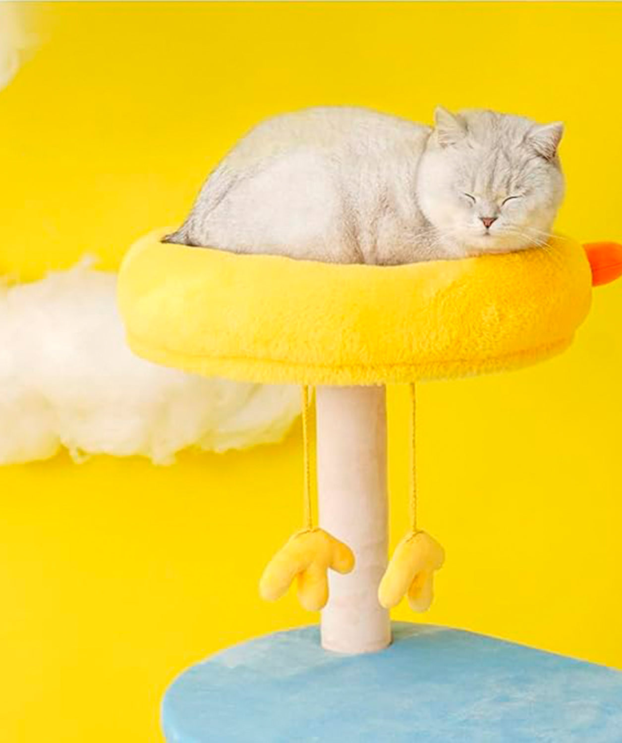 El Farm Chicken Cat Tree combina juego, descanso y estilo en un diseño inspirado en una granja divertida, con un suave nido amarillo en forma de pollito en la parte superior, plataformas de colores y postes resistentes para rascar.