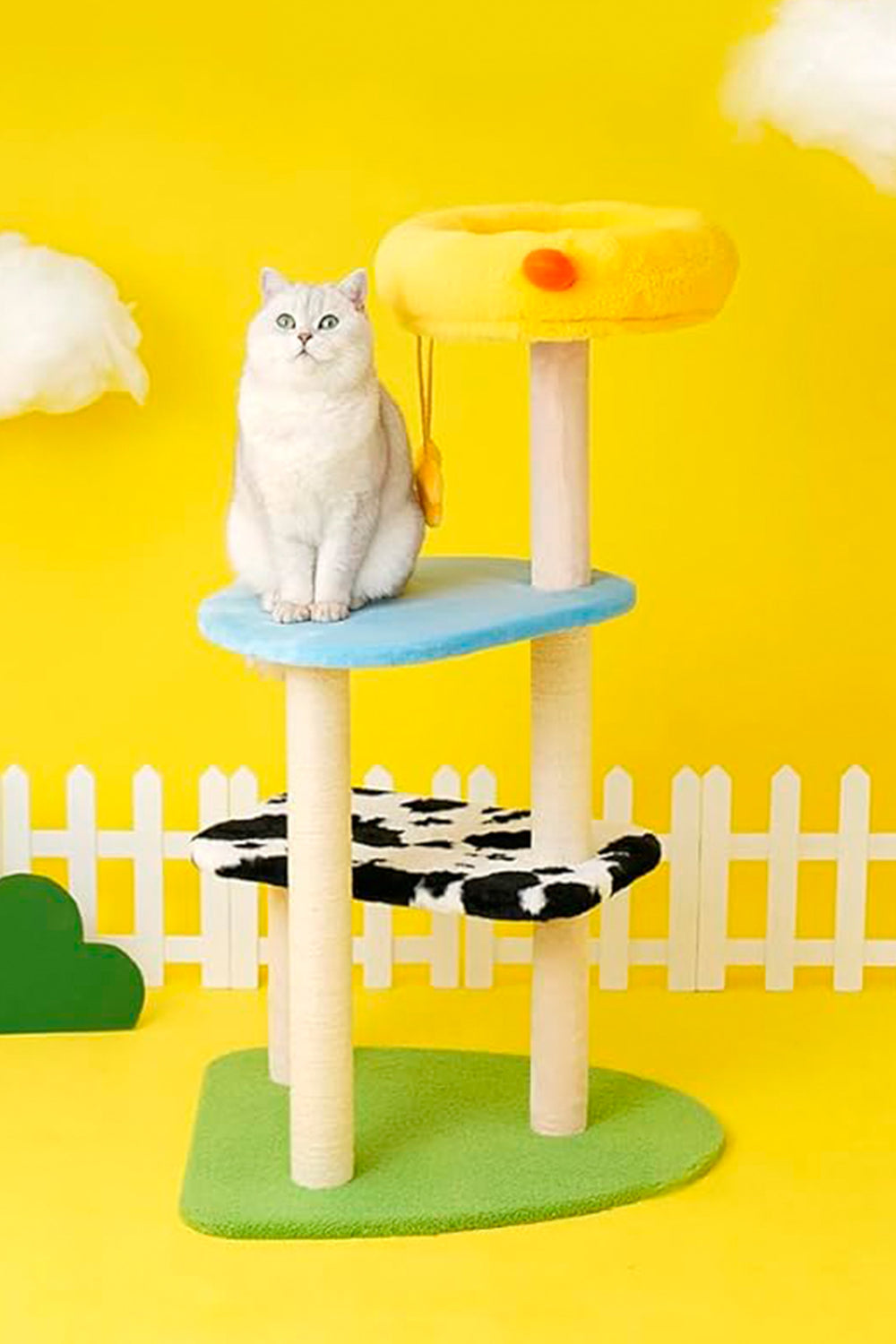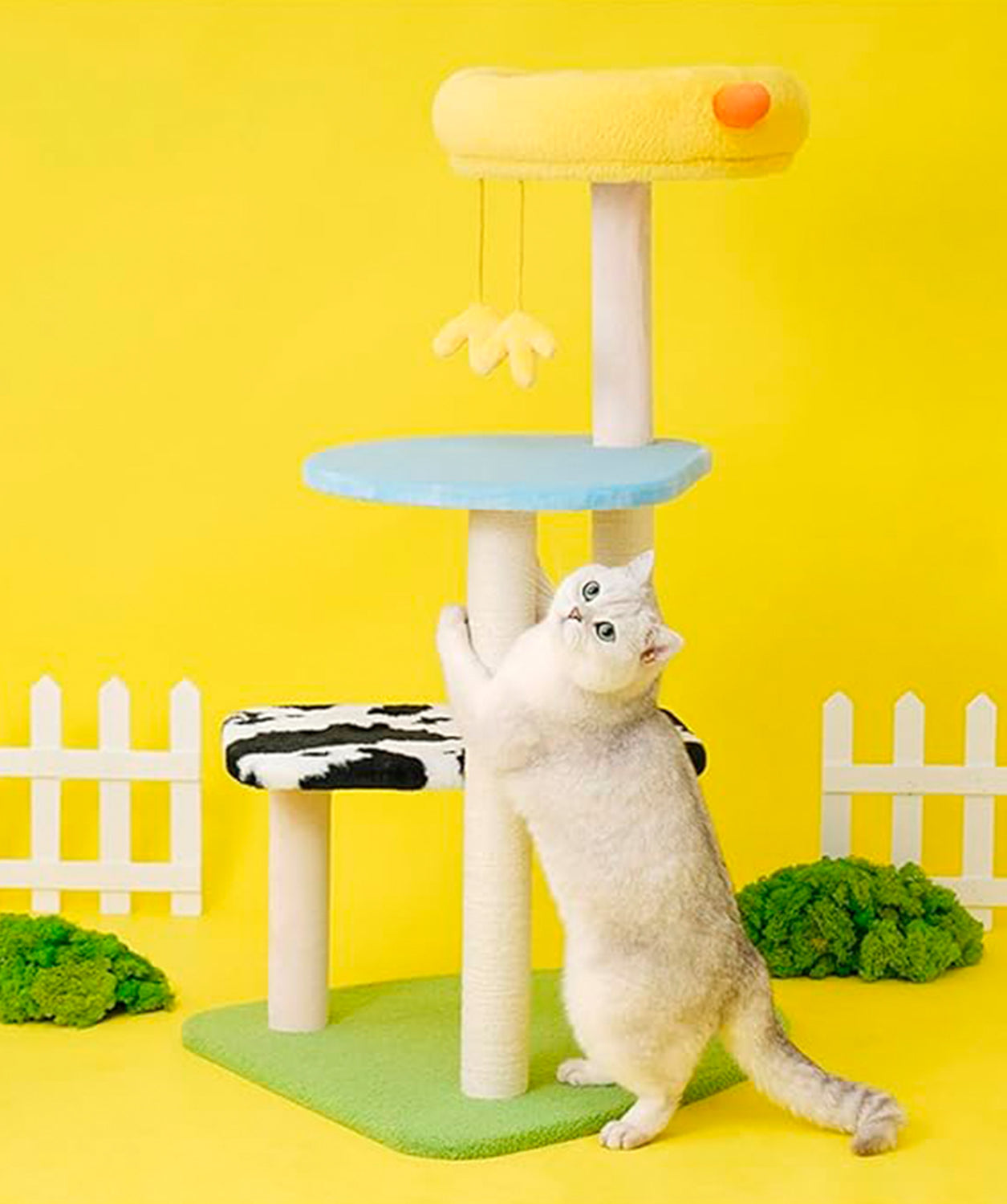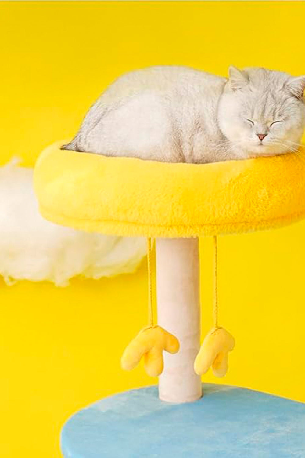 El Farm Chicken Cat Tree combina juego, descanso y estilo en un diseño inspirado en una granja divertida, con un suave nido amarillo en forma de pollito en la parte superior, plataformas de colores y postes resistentes para rascar.