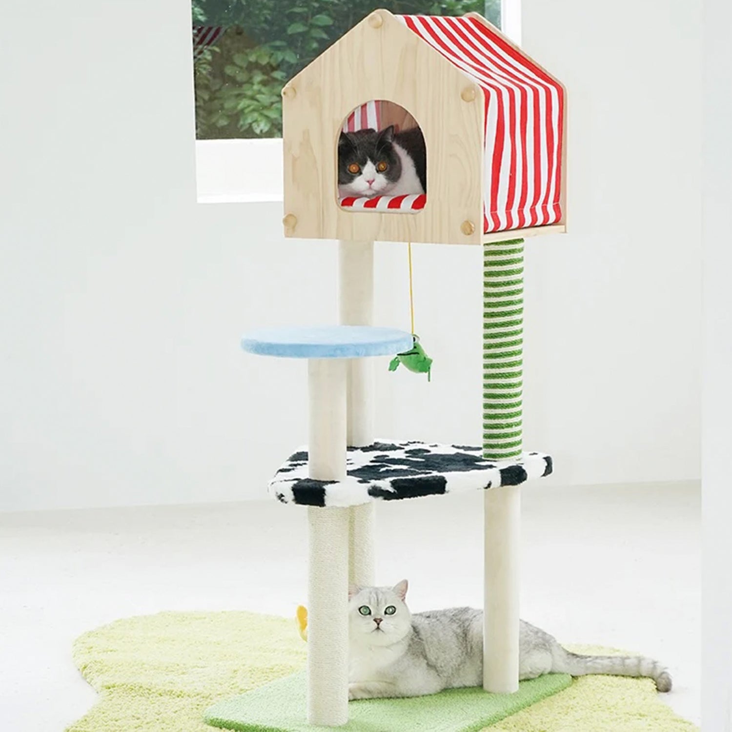 Su poste alto, forrado con cuerda resistente y franjas a rayas, invita a tu minino a estirarse y afilar sus uñas, ayudando a mantenerlas sanas y protegiendo tus muebles. Además, incorpora divertidos juguetes colgantes que estimulan su instinto cazador y lo mantienen entretenido.