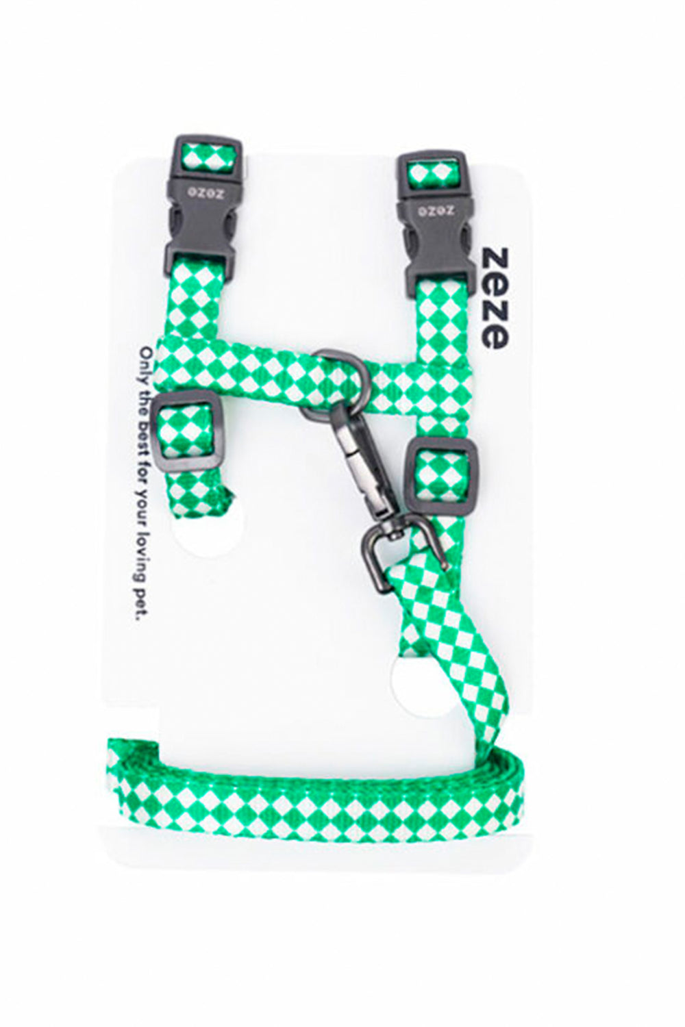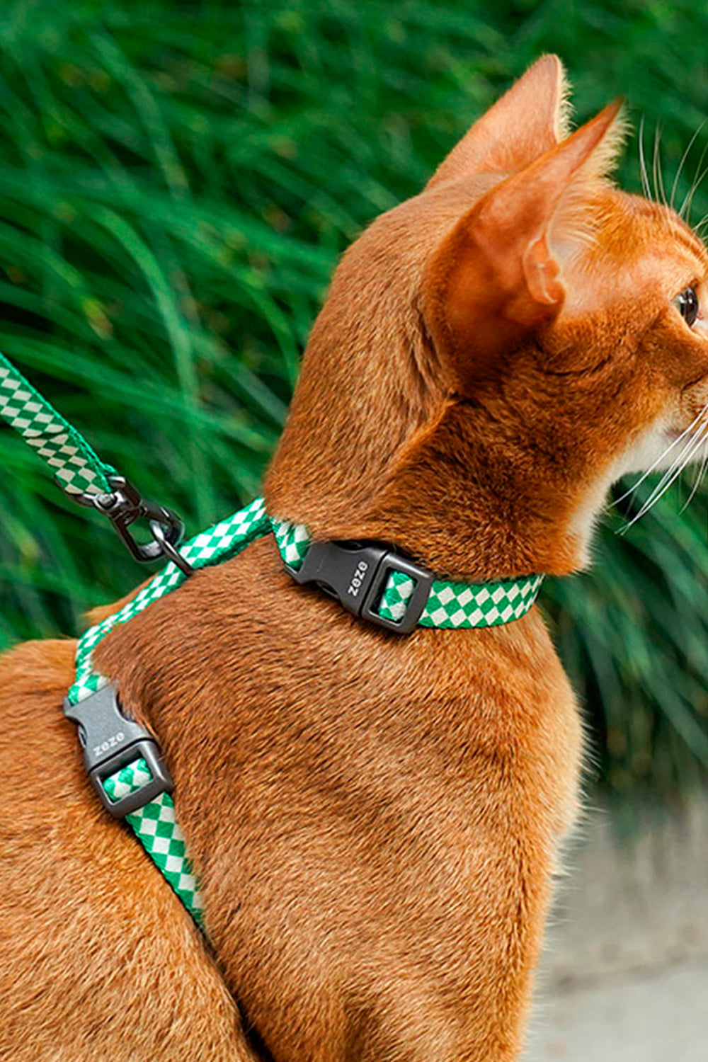 El Leash & Harness Kit con diseño de tablero de ajedrez es la combinación perfecta de estilo retro y comodidad para tu gato. Su patrón en verde y blanco aporta un aire moderno y elegante, ideal para dueños que buscan un accesorio práctico y con personalidad.