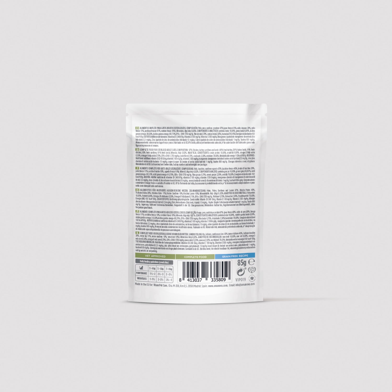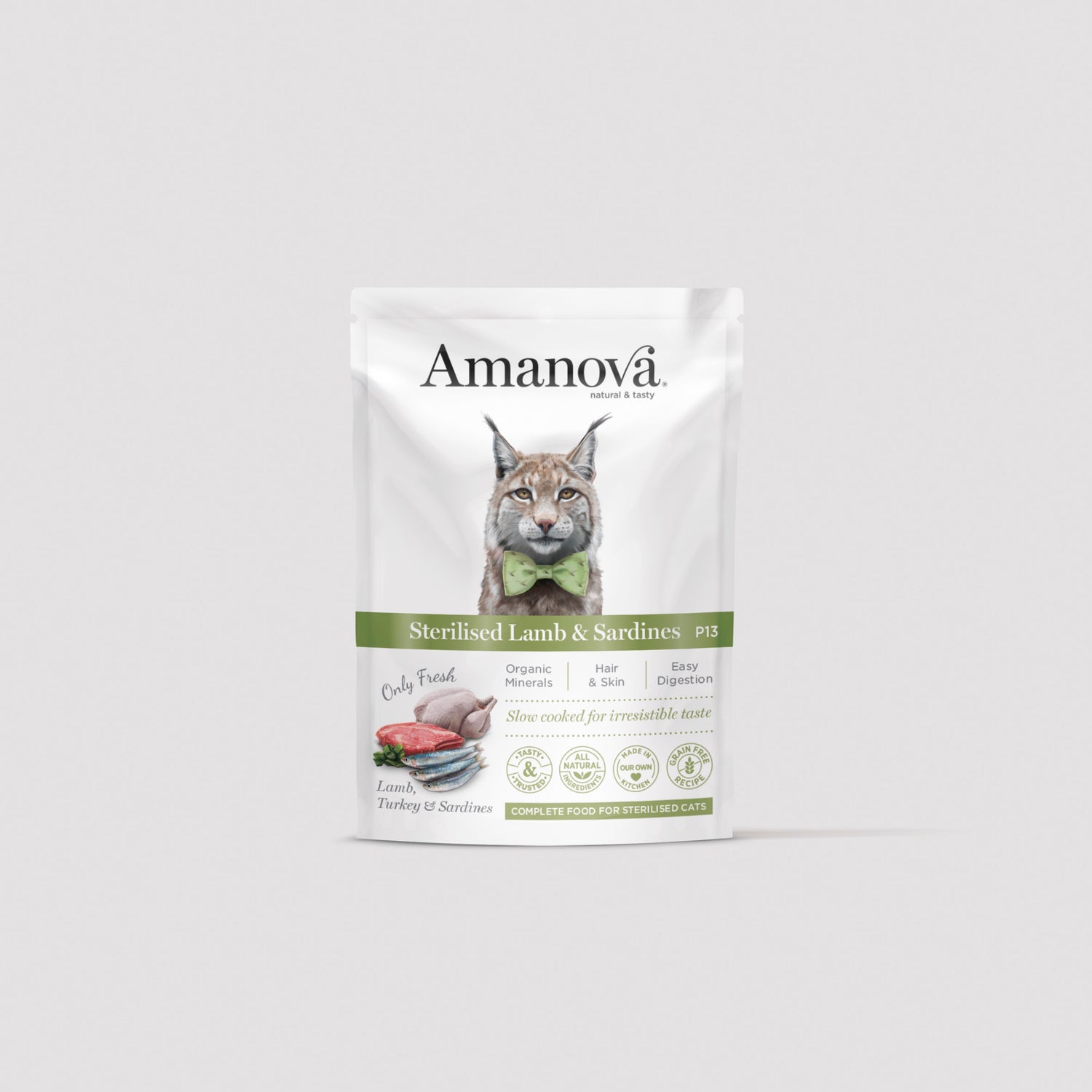 ¡El alimento diario perfecto para los gatos esterilizados! Esta comida húmeda sin cereales es nutricionalmente completa y está elaborada con carne fresca de cordero, sardinas, pollo y pavo.