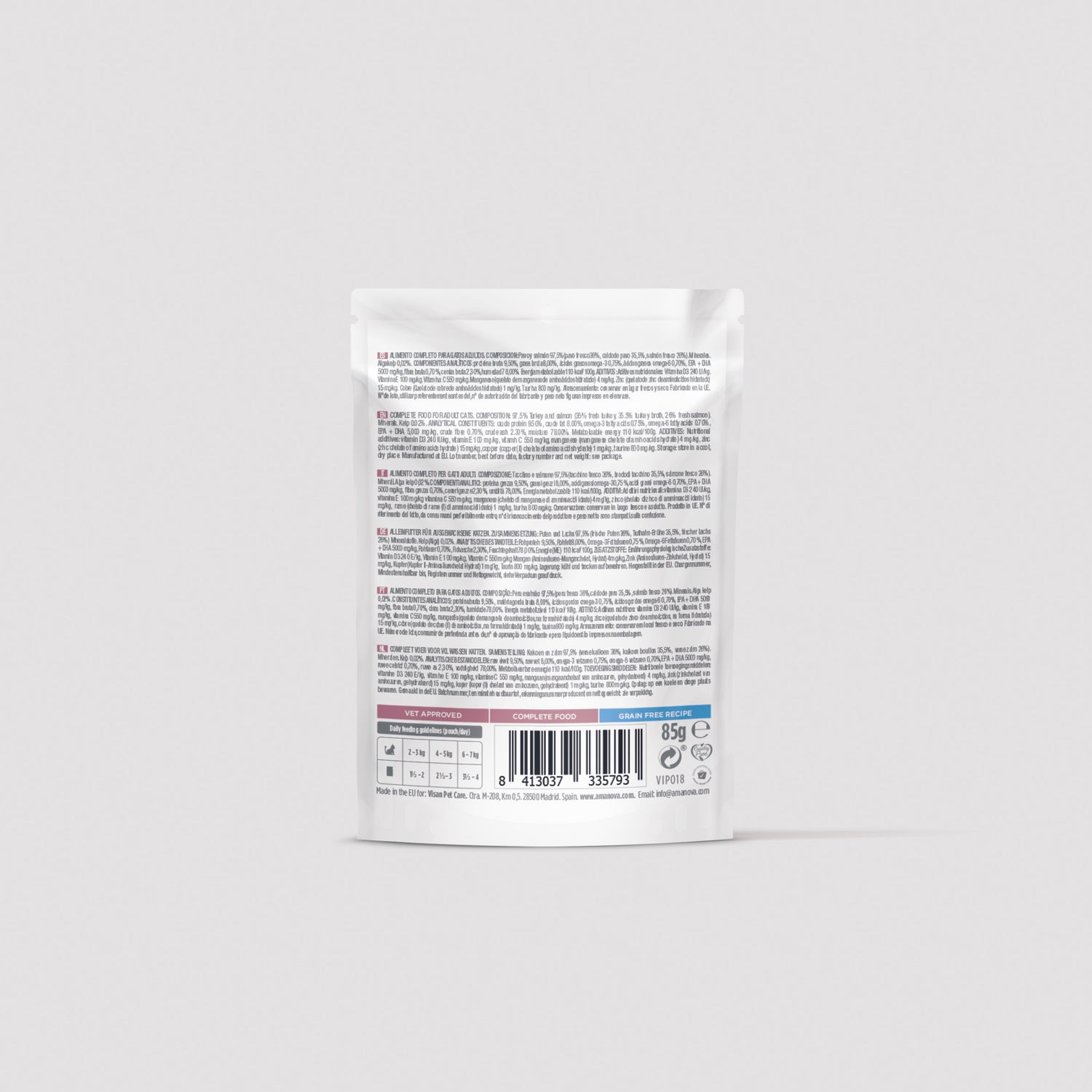 Irresistivelmente deliciosa, esta comida húmida para gatos é nutricionalmente completa, não contém cereais e é elaborada com salmão e peru frescos da mais alta qualidade.A sua receita exclusiva é cozinhada lentamente na nossa própria cozinha e inclui outros ingredientes naturais, como saborosas algas ricas em minerais e cheias de benefícios para a saúde do seu animal de estimação. Para manter o seu amigo felino nas melhores condições, a nossa comida húmida de salmão e peru incorpora vitaminas C, D3 e E, bem como minerais quelatados que melhoram a absorção dos nutrientes. Além disso, o seu teor natural de taurina ajuda a cuidar da saúde do coração e dos olhos. Tão saborosa quanto nutritiva, é um alimento ideal para a dieta diária de um gato saudável e feliz. Vai pôr o seu gatinho a ronronar de satisfação!