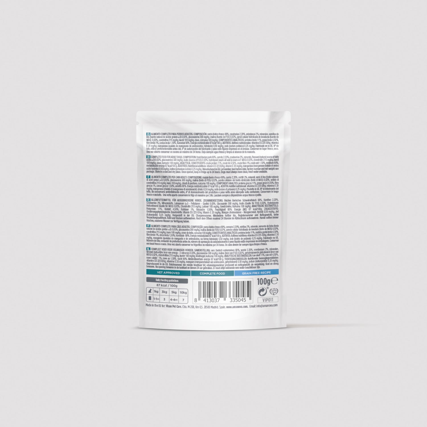 O prato perfeito de porco, este alimento hipoalergénico e sem cereais para cães é nutricionalmente completo e elaborado com o porco 100% ibérico mais fresco, cozinhado lentamente na nossa própria cozinha. Adicionámos à receita alguns superalimentos muito especiais, incluindo deliciosas cenouras, mirtilos picantes, sementes de linhaça ricas em ácidos gordos, louro saudável, cravinho e curcuma. Para manter o seu companheiro canino em perfeita condição, também acrescentámos vitaminas A, D e E, bem como minerais quelatados para melhorar a absorção dos nutrientes, e glucosamina e condroitina para ajudar a manter a flexibilidade e mobilidade das articulações. Deliciosa e nutritiva, é a receita perfeita para um amigo de quatro patas mais saudável e feliz.