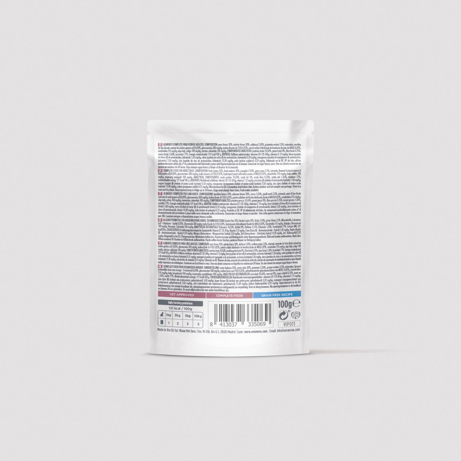 peru fresco 35%, salmão fresco 30%, abóbora 2,50%, ervilhas verdes 2,5%, minerais, sementes de linho (fonte natural de ácidos gordos ω3) 0,03%, glucosamina 300 mg/kg, inulina (fonte de FOS) 0,02%, parede celular hidrolisada de leveduras (fonte de MOS) 0,02%, condroitina 215 mg/kg, alga kelp, urtiga 100 mg/kg, alecrim, calêndula 100 mg/kg.